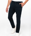 98% cotton twill/2% elastane. Enzyme washed.Modern style.Flat front.Belt loops.Zip fly with button over.Two side pockets.Ticket and coin pocket.Rear piped pockets.