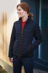 Water resistant finish, recycled outer fabric, faux suede binding, 100g recycled wadding, 2 outer side pockets, 1 inside zip pocket, 2 drawstring toggles at side seams.
